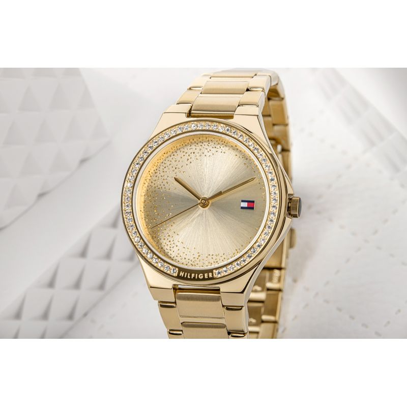 Die Tommy Hilfiger Juliette ist ein wahres Meisterwerk, das wie ein Sternenhimmel funkelt. Ihr mit Zirkonia besetztes Goldgehäuse und das zart mit Goldstaub bestreute Zifferblatt sind ein Symbol für Eleganz – perfekt für Frauen, die in jeder Situation glänzen möchten.