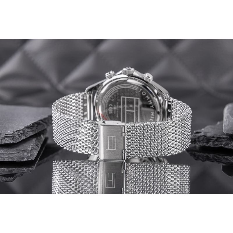 Seine maskuline Ästhetik schmiegt sich perfekt ans Handgelenk an und setzt einen eleganten Akzent, der jedes Outfit – von leger bis formell – aufwertet. Die robuste Mesh-Konstruktion wirkt leicht und modern und zieht gleichzeitig alle Blicke auf sich. Das aus hochwertigem Edelstahl gefertigte Armband sieht nicht nur gut aus, sondern garantiert auch Langlebigkeit und hohen Tragekomfort den ganzen Tag. Ein dezentes Tommy Hilfiger Logo auf der Schließe rundet den Look ab und unterstreicht die Klasse und den Prestige der Uhr.