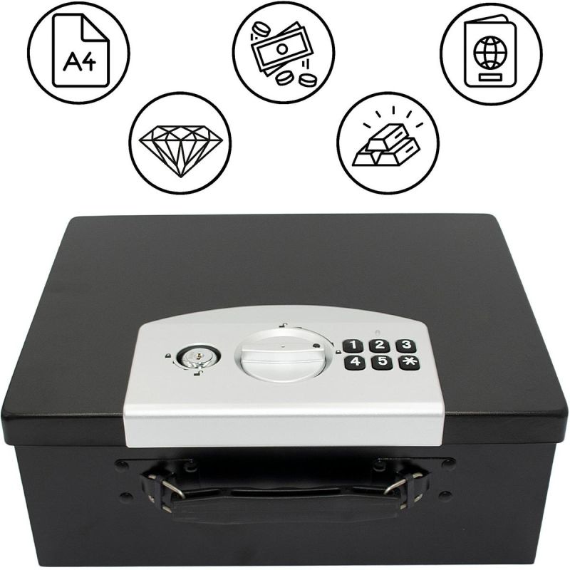 Dank seiner robusten Bauweise und intuitiven Bedienung eignet sich dieser Safe ideal für den Einsatz in Privathaushalten, Büros, Hotels oder Geschäften. Er bietet optimalen Schutz vor unbefugtem Zugriff und ist perfekt geeignet zur Aufbewahrung von Bargeld, wichtigen Dokumenten, Schlüsseln, Schmuck, Datenträgern und anderen Wertgegenständen.