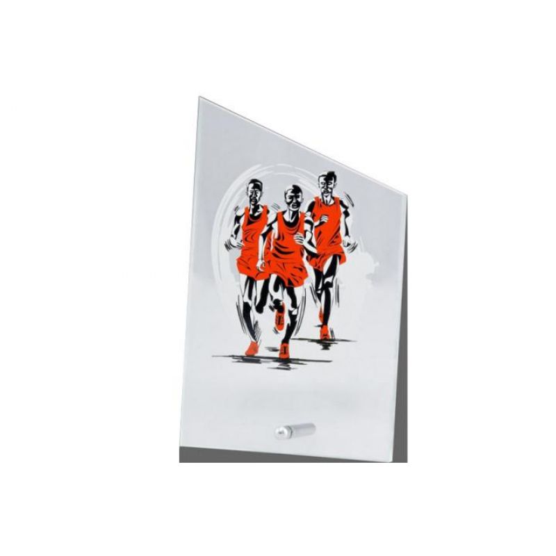 Die Trophäe besteht aus Glas mit einem Metallträger mit Marathon-Motiv. Eine Gravur auf der Plakette ist als Zusatzleistung möglich (Preis abhängig von der Druckfläche).