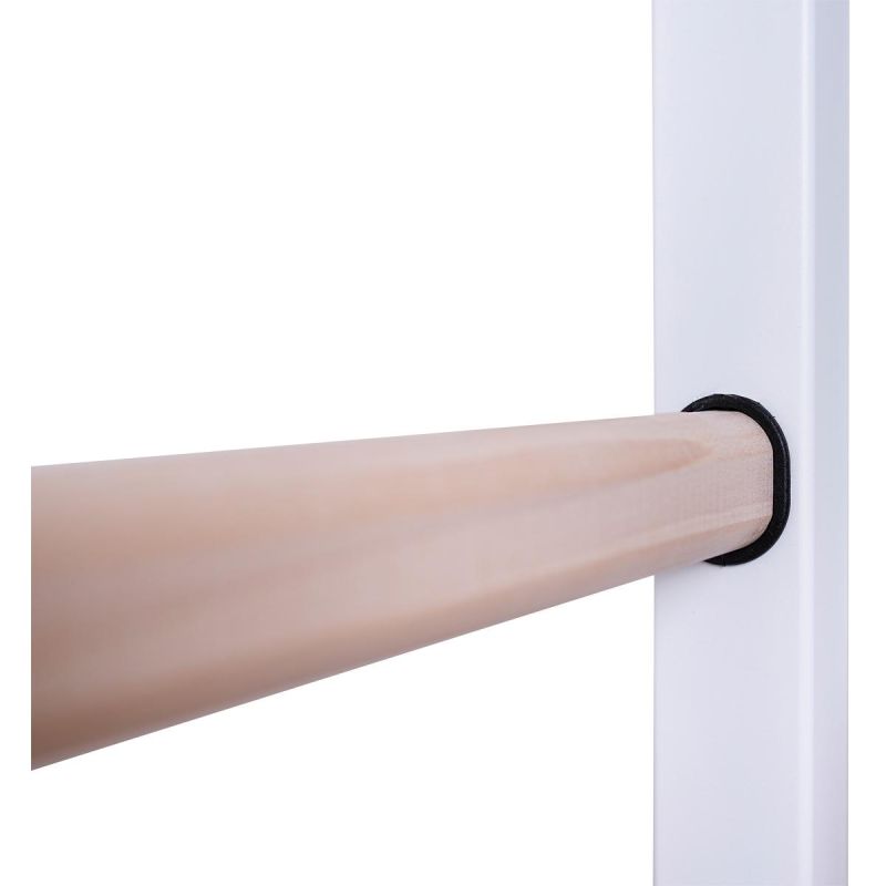 Die Turnleiter ist eine stabile Konstruktion, die speziell für Kinder im Schulalter und ihre Eltern entwickelt wurde. Die weiße Farbe der Leiter in Kombination mit den Sprossen aus naturbelassenem Buchenholz verleiht ihr ein einzigartiges Aussehen. Die natürliche und dezente Farbgebung macht sie zur perfekten Ergänzung für jedes Kinderzimmer. Ein weiterer Vorteil ist die flexible Montagemöglichkeit, die kein Bohren an der Wand erfordert. Diese multifunktionale Turnleiter besteht aus Metallprofilen (50 mm x 40 mm) und handgeölten Buchenholzsprossen. Die einheitlichen, vertikalen Seitenprofile sind weiß pulverbeschichtet. Die Leiter ist nicht nur ein optisches Highlight, sondern auch ein unverzichtbares Element im Kinderzimmer. Ein weiterer Vorteil ist ihr geringer Platzbedarf. Die Leiter ist sehr robust und für hohe Belastungen geeignet. Die maximale Benutzerbelastung beträgt 150 kg. Neben der Leiter umfasst das Set eine Klimmzugstange, Turnringe und eine Seilschaukel. Die Leiter kann an der Wand befestigt oder vom Boden bis zur Decke aufgehängt werden.