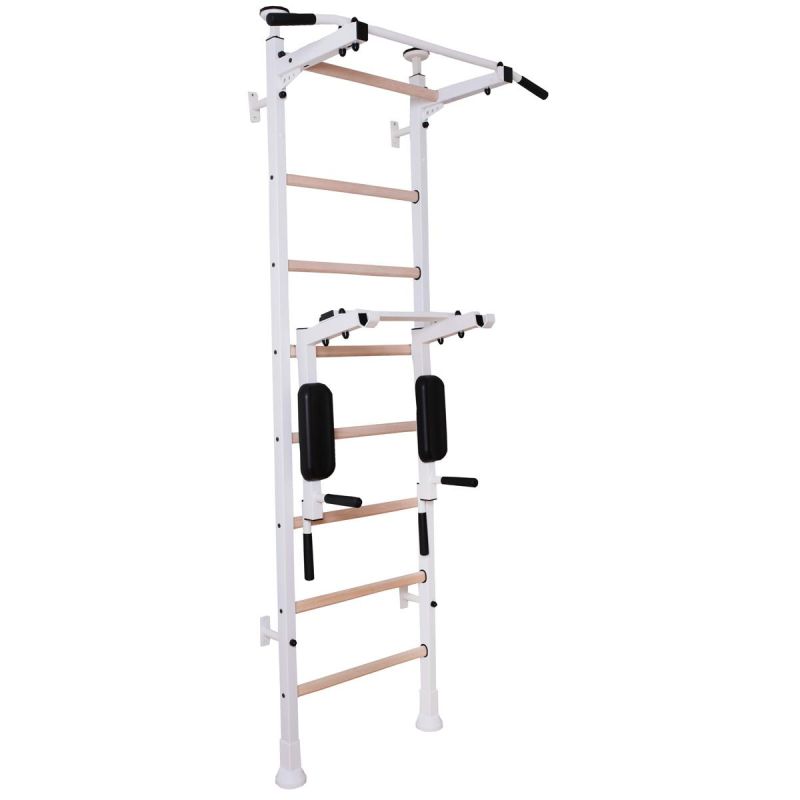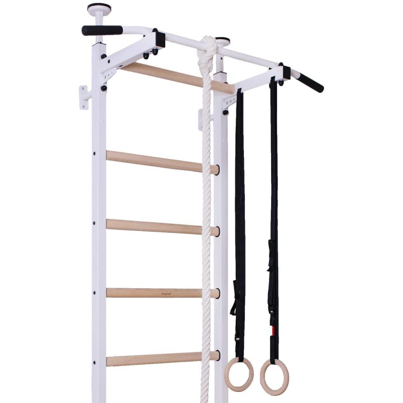 Die Turnleiter ist eine stabile Konstruktion, die speziell für Kinder im Schulalter und ihre Eltern entwickelt wurde. Die weiße Farbe der Leiter in Kombination mit den Sprossen aus naturbelassenem Buchenholz verleiht ihr ein einzigartiges Aussehen. Die natürliche und dezente Farbgebung macht sie zur perfekten Ergänzung für jedes Kinderzimmer. Ein weiterer Vorteil ist die flexible Montagemöglichkeit, die kein Bohren an der Wand erfordert. Diese multifunktionale Turnleiter besteht aus Metallprofilen (50 mm x 40 mm) und handgeölten Buchenholzsprossen. Die einheitlichen, vertikalen Seitenprofile sind weiß pulverbeschichtet. Die Leiter ist nicht nur ein optisches Highlight, sondern auch ein unverzichtbares Element im Kinderzimmer. Ein weiterer Vorteil ist ihr geringer Platzbedarf. Die Leiter ist sehr robust und für hohe Belastungen geeignet. Die maximale Benutzerbelastung beträgt 150 kg. Neben der Leiter umfasst das Set eine Klimmzugstange, ein Geländer, eine Bank, Turnringe und eine Seilschaukel. Die Leiter kann an der Wand befestigt oder vom Boden bis zur Decke aufgehängt werden.