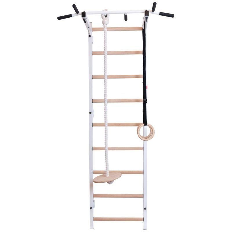 Die vertikalen Profile (50 mm x 40 mm) der Leiter bestehen aus hochwertigem, pulverbeschichtetem Metall. Die Sprossen sind aus ovalem Buchenholz gefertigt und handbemalt. Am oberen Ende der Leiter befindet sich eine fest montierte Klimmzugstange aus Metall. Diese verfügt über sechs Griffe, die Arm- und Rückenübungen mit verschiedenen Griffpositionen ermöglichen. Die Klimmzugstange ist 115 cm lang.