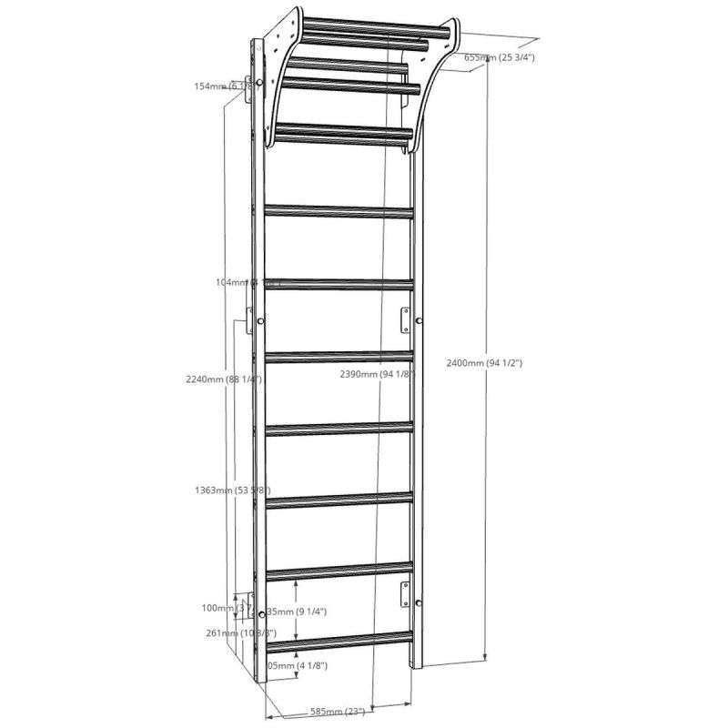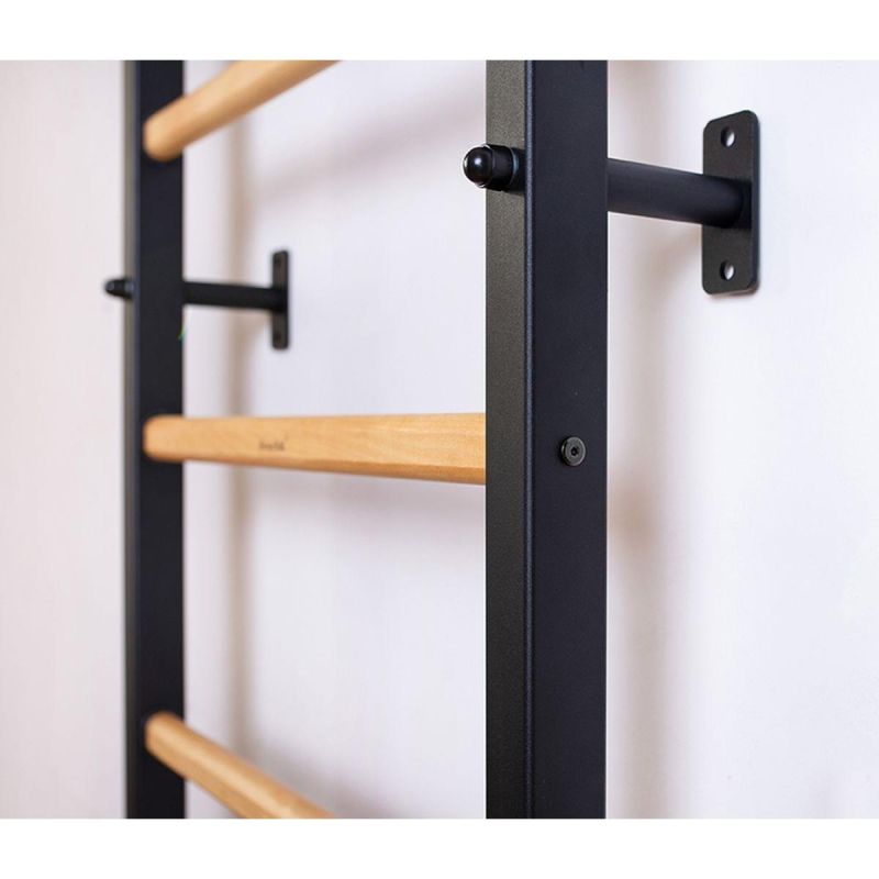 Die Sprossenwand BenchK 310B mit Holzgriff ist eine erweiterte Version der BenchK 310B/710B. Die vertikalen Profile (40 mm x 50 mm) sind aus hochwertigem Metall gefertigt und mattschwarz/mattweiß pulverbeschichtet. Die ovalen Sprossen bestehen aus massiver Buche. Ihre Oberfläche ist von Hand mit zwei Schichten lebensmittelechtem, organischem Leinöl aus Deutschland behandelt.