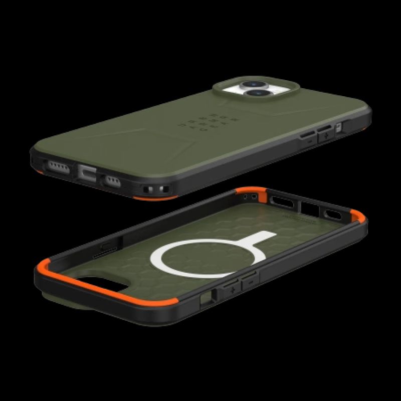 UAG Civilian DER STÄRKSTE DER STÄRKSTEN HYPERCRUSH Civilian gehört zur Gruppe der leistungsstärksten Serien der Marke UAG. Hierbei handelt es sich um eine Gehäuseserie, die sich durch die besondere HyperCuch-Funktion auszeichnet. HyperCrush ist ein Effekt, der durch die Kombination von TPU mit Polycarbonat erzielt wird. Auf der Oberfläche beider Materialien bildete sich ein Sechseckmuster. Die resultierende Struktur erzeugt ein gepanzertes Exoskelett, das die Energie ableitet, die entsteht, wenn das Telefon mit der Oberfläche kollidiert. 100 % resistent gegen iPhone-Stürze aus bis zu 6 m Höhe! kompatibel mit kabellosem Laden und MagSafe MAGSAFE Dank des im Gehäuse integrierten Magnetmoduls ist Monarch mit Apple Pay-Zahlungen und MagSafe-Funktionalität kompatibel. MagSafe stellt sicher, dass Ihr Telefon genau am Ladepunkt des kabellosen Ladegeräts positioniert ist. Sie müssen Ihr Telefon lediglich an die Ladematrix halten, und beide Geräte ziehen sich perfekt aneinander an und passen sich perfekt aneinander an, sodass ein stabiler Ladevorgang gewährleistet ist. ANSCHLÜSSE UND TASTEN Die Tasten und der Stummschalter des Telefons sind durch präzise gestaltete, bewegliche Gehäuseelemente vor Staub geschützt, die eine komfortable Nutzung der Telefonfunktionen gewährleisten. ZERTIFIZIERTER SCHUTZ Entspricht dem Militärstandard MIL STD 810G 516.6, der den Grad der Stoßfestigkeit im Falle eines Sturzes angibt.