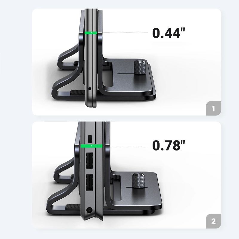 Der Ständer ist mit einem praktischen Knopf ausgestattet, mit dem Sie die Breite des Griffs einstellen können. Dadurch passt das Zubehör auf die meisten Laptops – alle mit einer Dicke zwischen 12 und 26 mm.