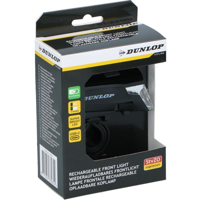 Suchen Sie eine bequem aufladbare und leistungsstarke Fahrradlampe? Die Dunlop LED-Frontleuchte mit CE- und StVZO-Zertifizierung, USB-C-Ladefunktion und drei Beleuchtungsmodi gewährleistet sicheres Fahren, lange Laufzeit und moderne Funktionalität.
