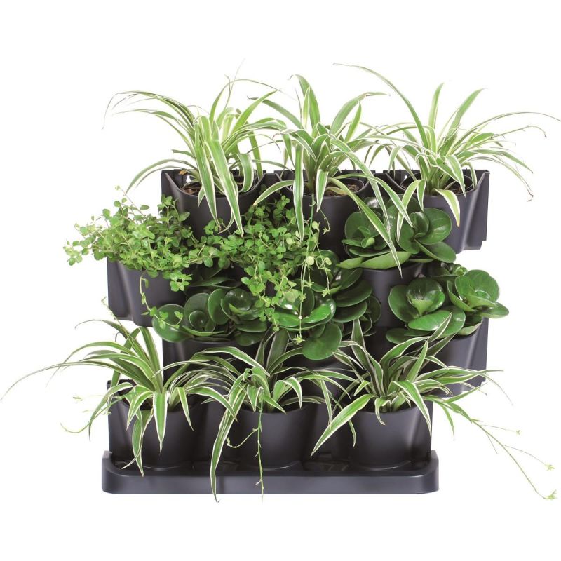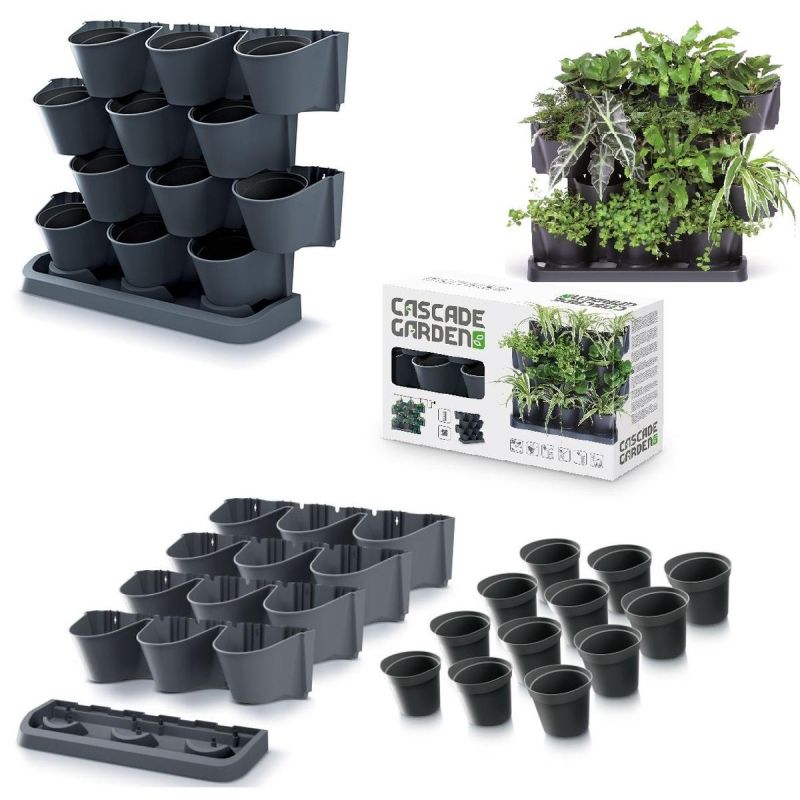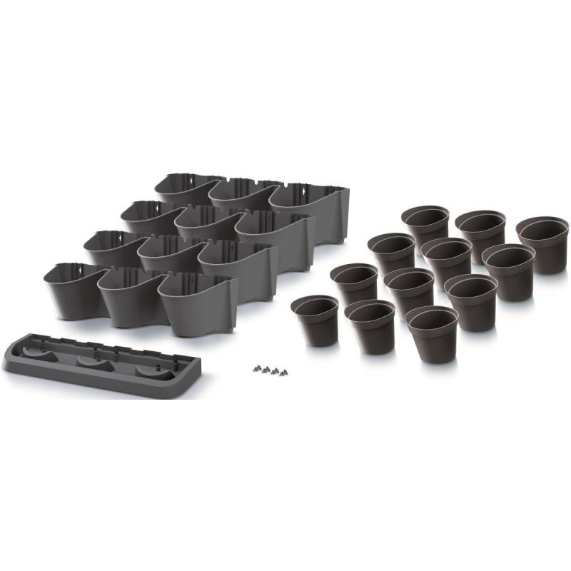 - Das Set besteht aus 21 Teilen: 4 Modulen mit je 3 Löchern für Blumentöpfe, 12 Blumentöpfen, 1 Abtropfschale und 8 Verbindungsstücken zu anderen Modulen.