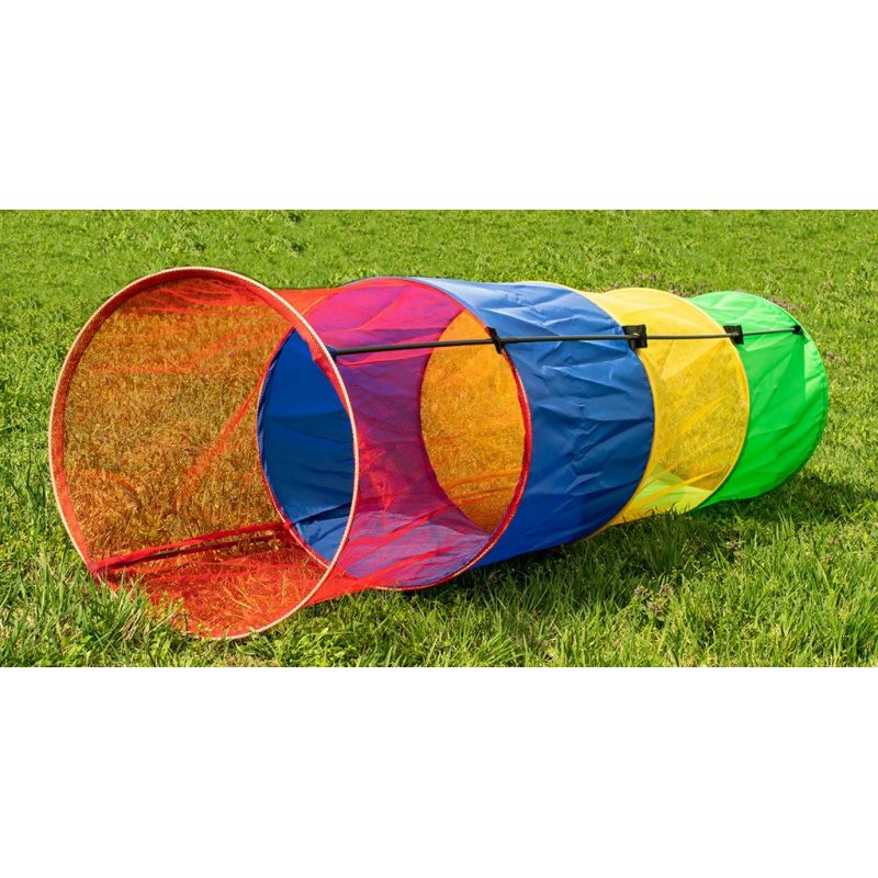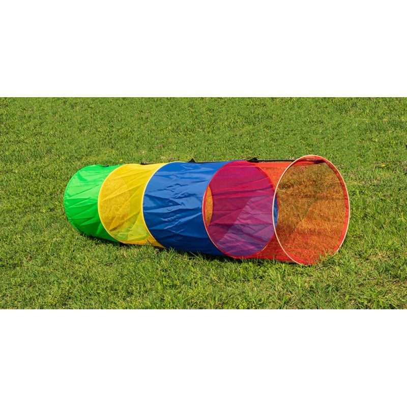 Der Tunnel besteht aus vier bunten, kreisförmigen Paneelen. Die Paneele bestehen aus buntem Netzgewebe und einfarbigem Stoff. Die Maße des Tunnels betragen 240 cm x 60 cm. Der Tunnel lässt sich leicht aufbauen und transportieren. Der Rahmen (Reifen) besteht aus flexiblem Kunststoff, ebenso wie die Querstreben, die den Tunnel vor dem Einsturz sichern.