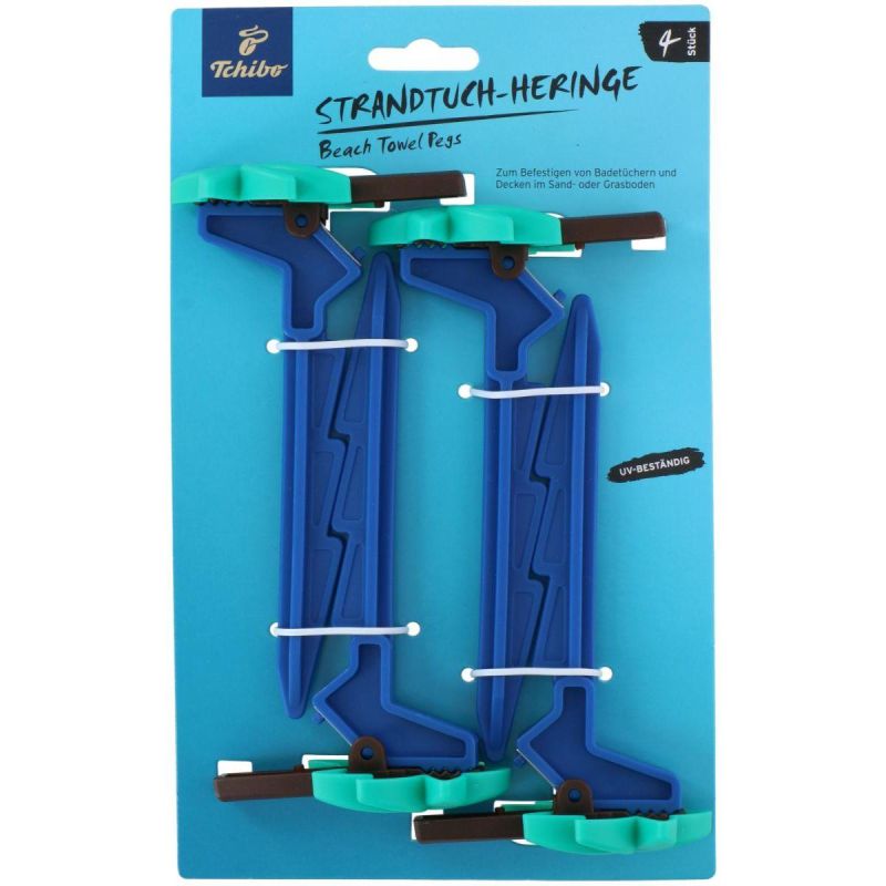 Heringe, Klemmen und Halterungen für Strandtücher und Decken (4 Stück, blau) helfen Ihnen, Ihr Zelt, Ihre Stranddecke oder Ihren Windschutz sicher am Boden zu befestigen. Das Set enthält 4 große Kunststoffheringe mit einem langen, stabilen V-förmigen Dorn.