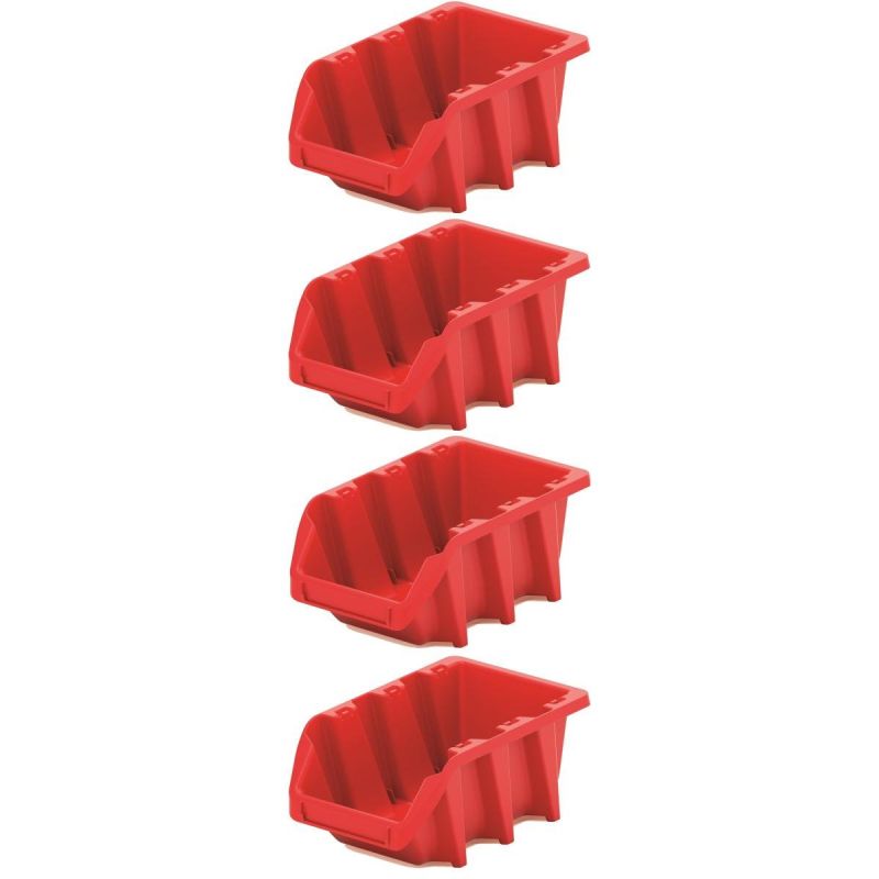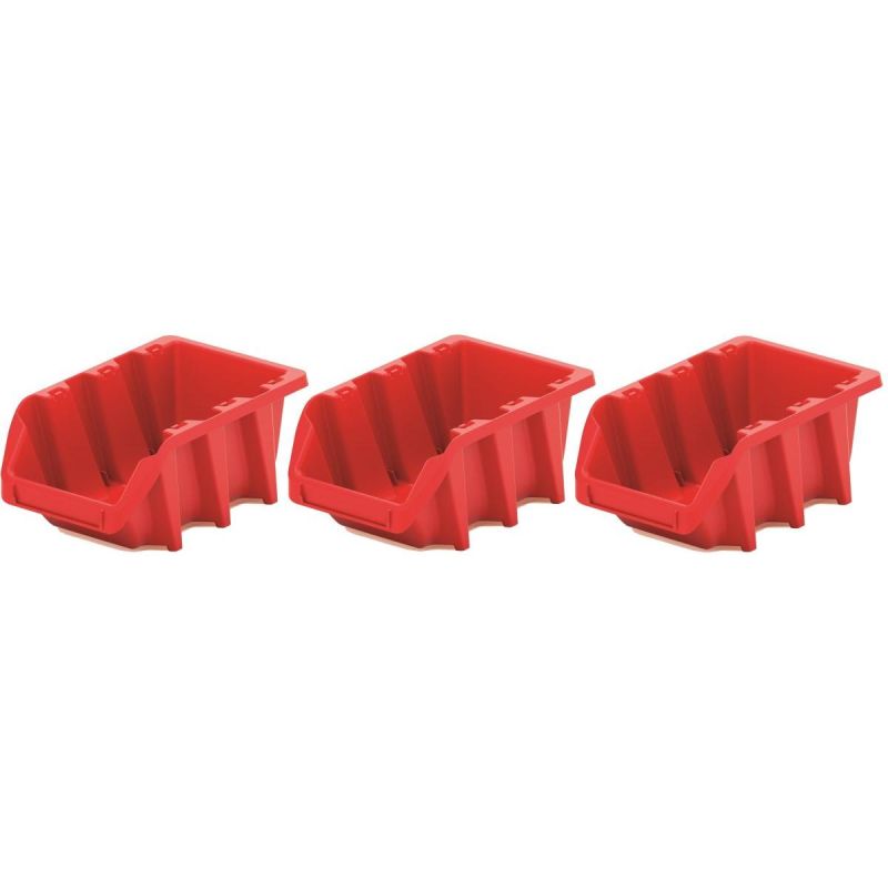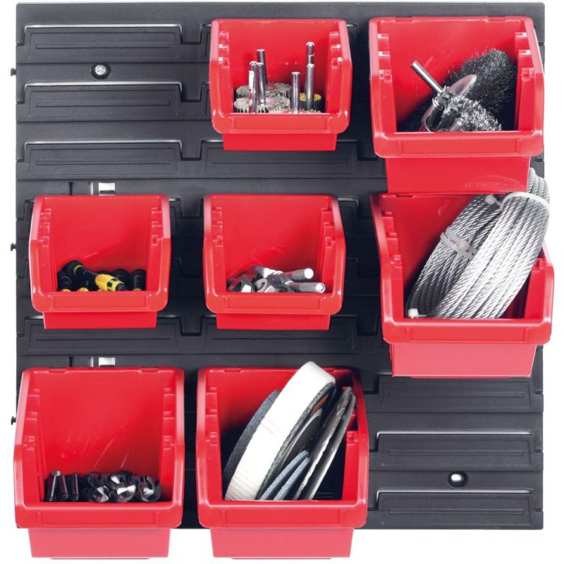 - Sieben Behälter in zwei Größen und eine Montageplatte ermöglichen die Organisation verschiedener Werkzeugtypen in der Werkstatt.