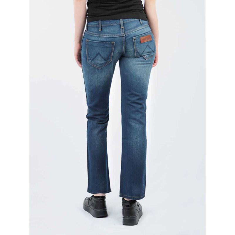 Damenjeans mit ausgestelltem Bein und niedrigem Bund. Reißverschluss und charakteristischer schwarzer Knopf. Ein markanter Lederaufnäher mit dem Logo des Herstellers ziert die Gesäßtasche.