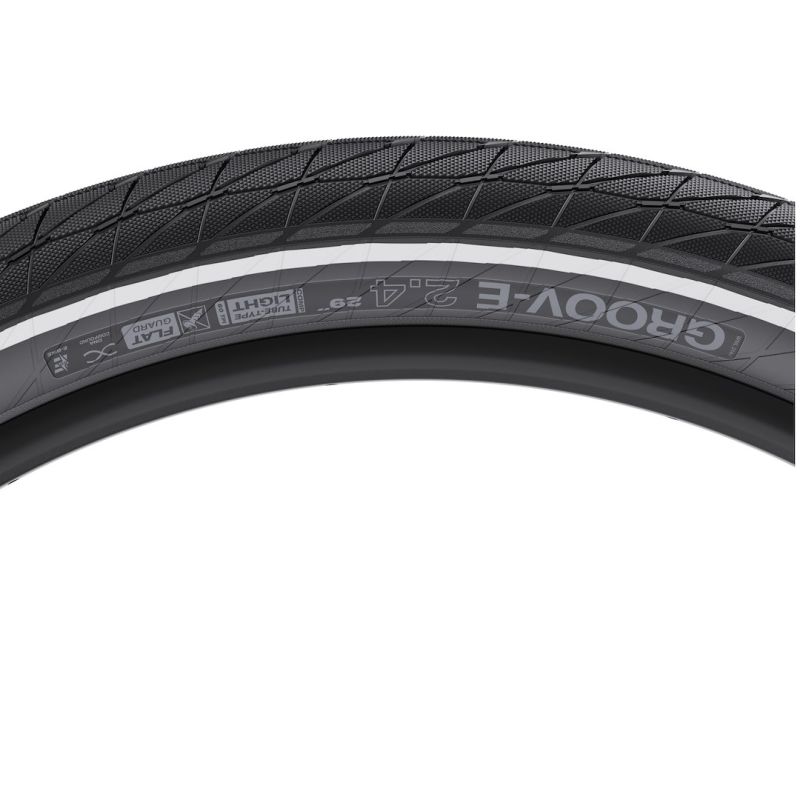 Der Groov-E ist der erste Reifen von WTB, der speziell für E-Bikes entwickelt wurde. Das gesamte Profil verfügt über eine strukturierte Oberfläche mit wasserableitenden Rillen für optimale Traktion. Alle Versionen sind mit einer 60-TPI-Karkasse ausgestattet, die Flat Guard-Version bietet zusätzlich eine Gummischicht für unübertroffene Haltbarkeit. Groov-E-Reifen verfügen über einen reflektierenden Streifen, der die Sicherheit erhöht, indem er Radfahrer im Stadtverkehr besser sichtbar macht. Eine Version des Groov-E ist mit dem Flat Guard-Pannenschutz ausgestattet und erfüllt somit die ECE-R75-Mopedzertifizierung für E-Bikes mit hoher Belastung und hohen Geschwindigkeiten.