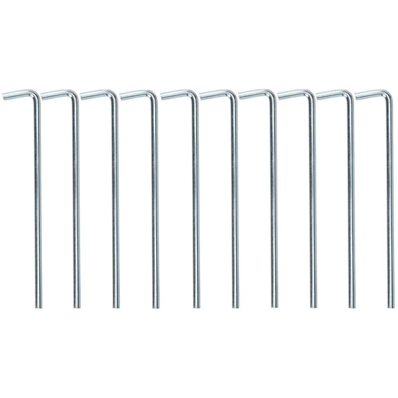 Das Set besteht aus 10 Metallheringen mit einem speziell gebogenen Griff, der das Einschlagen in den Boden erleichtert.