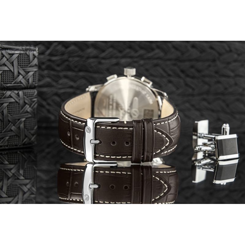 Die Verwendung eines einzigartigen, gewölbten Mineralglases ergänzt perfekt den vom klassischen Fliegerstil und seiner Geschichte inspirierten Stil. Das dicke, robuste Glas ist widerstandsfähig gegen mechanische Beschädigungen und gewährleistet so Langlebigkeit und Zuverlässigkeit im Alltag. Das gewölbte Glas verleiht der Uhr einen unverwechselbaren Charakter – es erzeugt einen subtilen Lichtbrechungseffekt, der dem Zifferblatt zusätzliche Tiefe verleiht und Details elegant und raffiniert hervorhebt. Die Funktionalität des gewölbten Mineralglases ist ebenso beeindruckend: Seine Form minimiert Lichtreflexionen und verbessert die Ablesbarkeit des Zifferblatts aus verschiedenen Blickwinkeln. Diese Lösung ist auch eine praktische Anspielung auf traditionelle Fliegeruhren, die unter allen Bedingungen und unabhängig von der Position des Trägers gut ablesbar sein mussten. Das gewölbte Glas ist nicht nur ein Designelement, sondern auch Ausdruck der Liebe zum Detail, die die Marke Zeppelin auszeichnet.