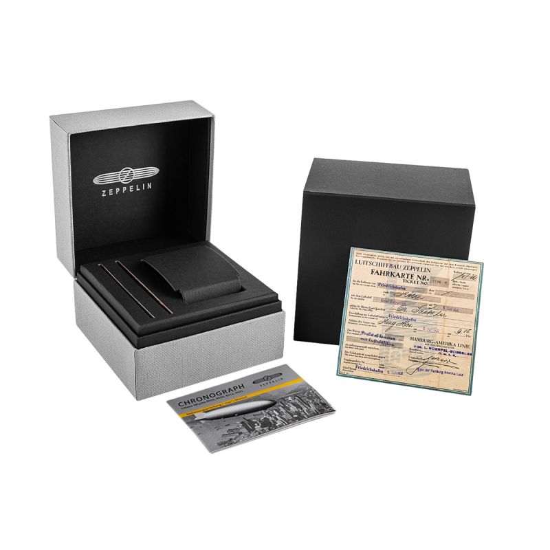 Jede Zeppelin-Uhr wird in einer einzigartigen, eleganten Box mit dem Markenlogo geliefert, die an die Tradition historischer Luftschiffe erinnert. Diese Verpackung ist nicht nur praktisch, sondern verkörpert auch Stil und Klasse und macht die Uhr zu etwas ganz Besonderem. Ein stilvolles Zertifikat, inspiriert von alten Zeppelin-Flugtickets, liegt ebenfalls bei und unterstreicht den Charakter dieser außergewöhnlichen Marke und ihre einzigartigen Wurzeln. Dank dieser Verpackung ist jede Uhr das perfekte Geschenk – jedes Detail, von der robusten Konstruktion der Box bis hin zu ihrer sorgfältig gestalteten Ästhetik, vermittelt ein Gefühl von Luxus und Prestige.