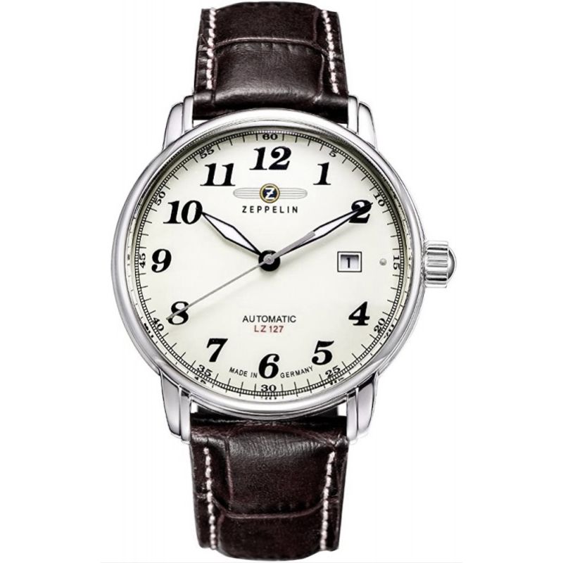 Die Herrenuhr Zeppelin LZ 127 Automatic 7656-5 ist ein eleganter Zeitmesser mit klassischem Charakter. Ausgestattet mit einem Miyota Kaliber 821A Automatikwerk mit 21 Steinen und einer Gangreserve von bis zu 42 Stunden, benötigt sie keine Batterie und bezieht ihre Energie aus der Bewegung Ihres Handgelenks. Das ca. 40 mm große Edelstahlgehäuse schützt ein beigefarbenes Zifferblatt und verleiht der Uhr zeitlosen Charme. Die Zeiger sind durch Mineralglas geschützt. Dieses Modell verfügt über eine Datumsanzeige und einen transparenten Gehäuseboden, der den Blick auf das Uhrwerk freigibt. Die Wasserdichtigkeit bis 5 ATM gewährleistet Sicherheit im Alltag und macht die Uhr zu einer praktischen und stilvollen Wahl.