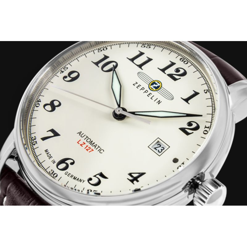 Zeppelin-Uhren zeichnen sich durch die Verwendung hochwertiger Materialien wie korrosionsbeständigem Edelstahl, besonders strapazierfähigen Lederarmbändern und kratzfestem Saphirglas aus. Viele Modelle verfügen zudem über Funktionen wie Datumsanzeige, Chronograph, Gangreserveanzeige und Mondphasenanzeige, was sie gleichermaßen praktisch und exklusiv macht. Die markanten Zifferblätter in Beige-, Schwarz- oder Cremeweißtönen, oft verziert mit filigranen gold- oder silberfarbenen Indizes und Zeigern, erinnern an die Eleganz von Luftschiffcockpits.