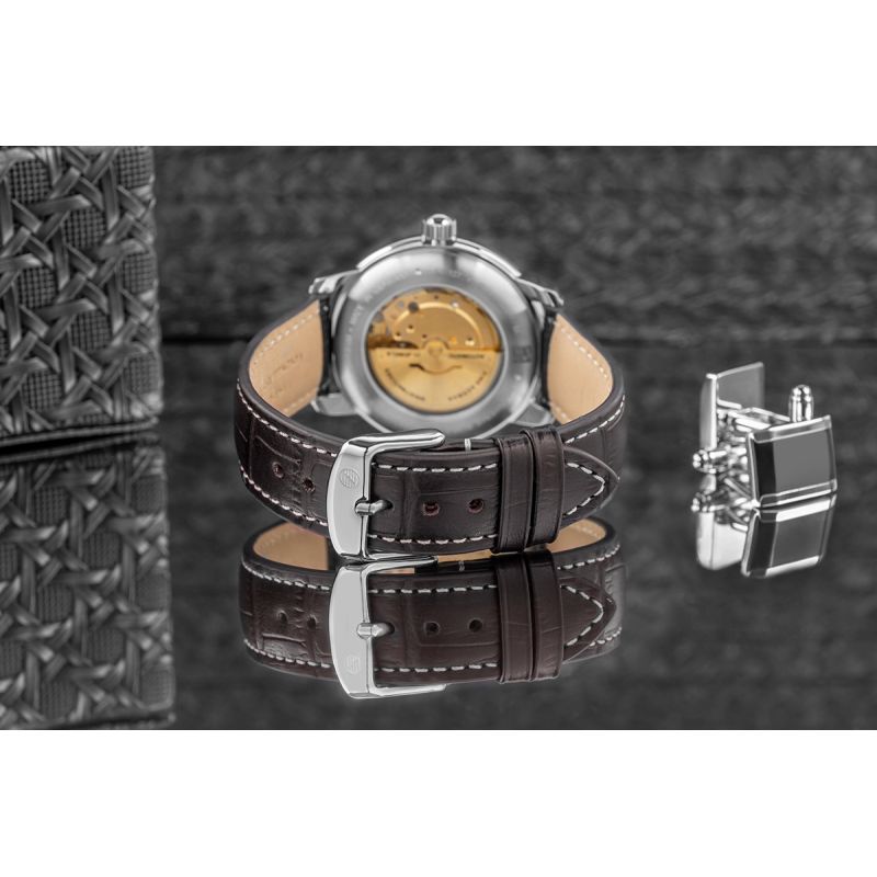 Der transparente Gehäuseboden, der den Blick auf das präzise gefertigte Automatikwerk freigibt, ist ein subtiles Detail, das den prestigeträchtigen Charakter der Uhr vollends unterstreicht. Dieses einzigartige Design ermöglicht es Ihnen, die meisterhafte Funktionsweise des Uhrwerks jederzeit zu bewundern und verleiht der Uhr so noch mehr Eleganz. Es ehrt die Uhrmachertradition, die auf mechanischer Präzision und höchster Handwerkskunst basiert.
