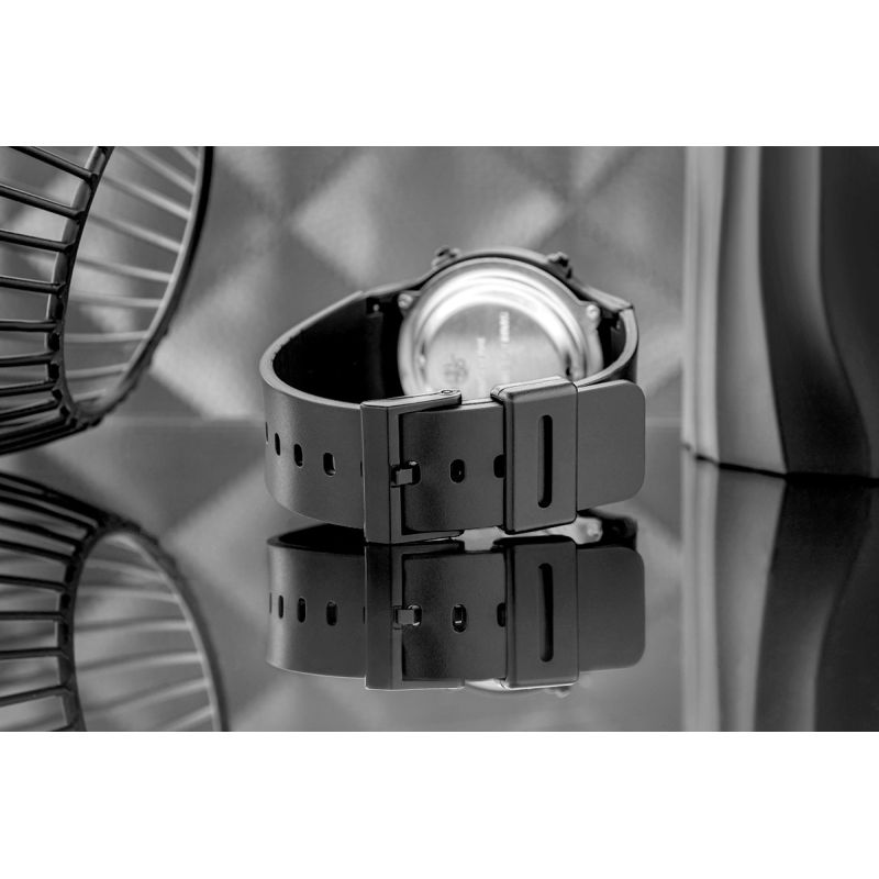 Das robuste Gehäuse und das klassische Design verleihen der Uhr eine elegante und zugleich funktionale Optik. Das schlanke, mattschwarze Gehäuse schmiegt sich angenehm ans Handgelenk, ohne unnötig aufzufallen.
