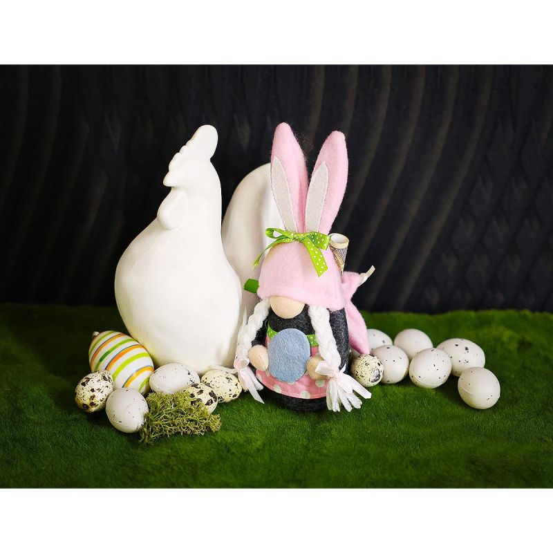 Der Wichtel verschönert und erfreut jedes Interieur, nicht nur zu Ostern, sondern das ganze Jahr über, und dank des mit Sand und Schaumstoff gefüllten Sockels kann man ihn auf einem Schrank, im Fenster oder im Kinderzimmer platzieren.